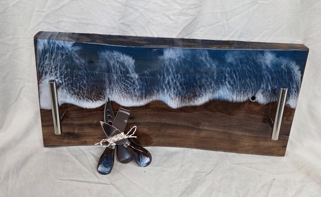 Walnut Rough Edge Ocean Scene Serving Tray w/Utensils – $40